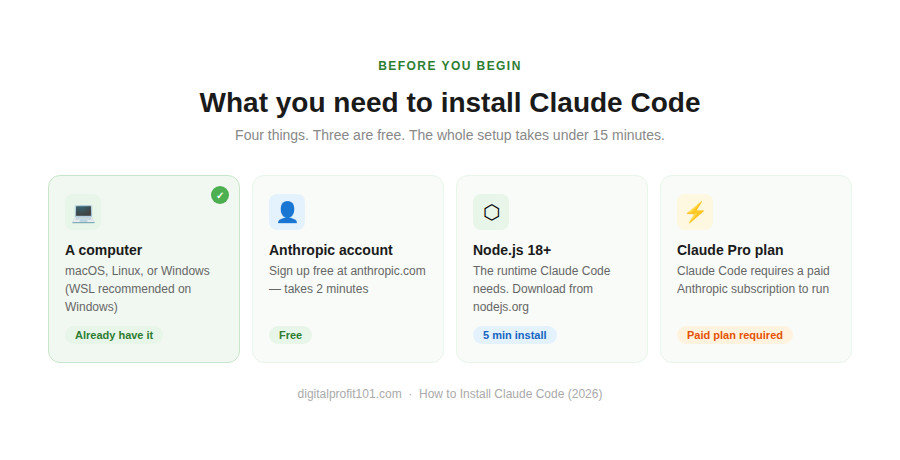 Before installing Claude Code itself, you need four things in place. Three of them are completely free.