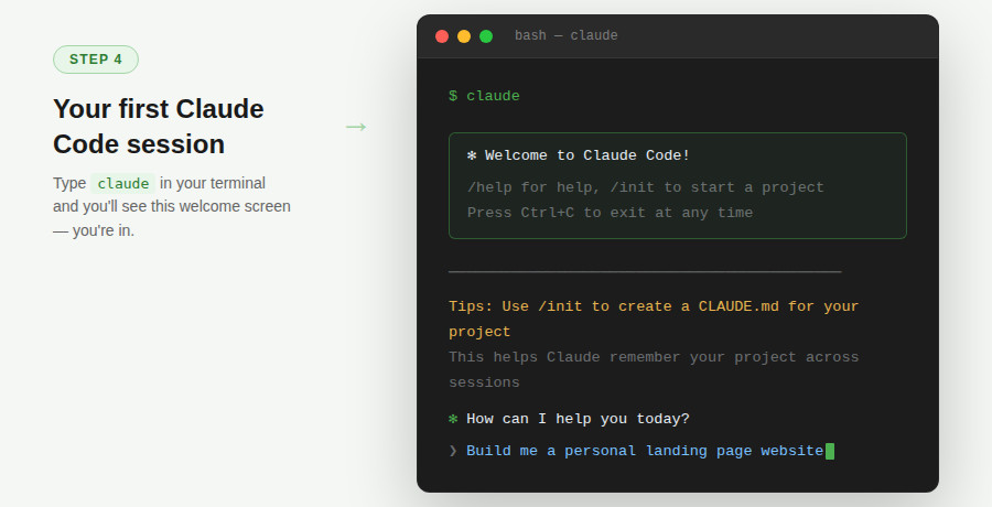 | Pro tip: run /init on every new projectThe /init command creates a CLAUDE.md file in your project root. This is a plain text file where Claude Code stores memory about your project – your tech stack, your coding standards, your preferred commands. Without it, every new session starts from scratch. With it, Claude Code already knows your project. |